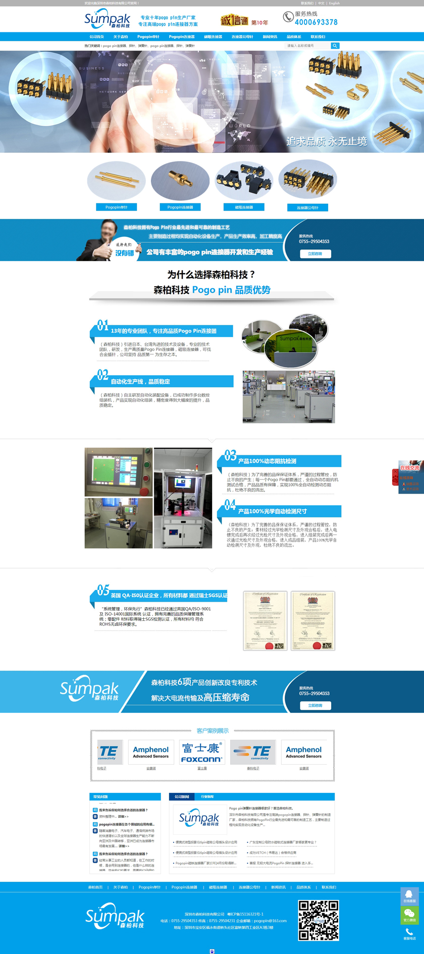 Project Description 深圳市森柏科技有限公司是专注高端pogo pin连接器、探针、弹簧针的制造厂家,森柏科技拥有Pogo Pin行业最先进和最可靠的制造工艺,主要制造过程均实现自动化设备生产,产品生产效率高,加工精度高,重要检测过程均采用自动化快速识别系统,大大降低了人为操作失误的风险,极大的提升了检测效率,工艺过程得到极大的改善和满足。因此产品质量和稳定性获得巨大突破。 Official website address 孝感http://www.zgsumpak.com I want to share